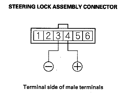 4. Connect the battery positive terminal to steering lock assembly connector terminal No. 4, and connect the battery negative terminal to No. 3 terminal. Make sure that the ignition key cannot be turned to the LOCK (0) position. Disconnect the battery terminals, and make sure that the key can be turned to the LOCK (0) position and removed from the cylinder.