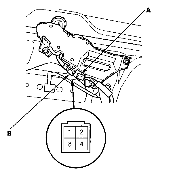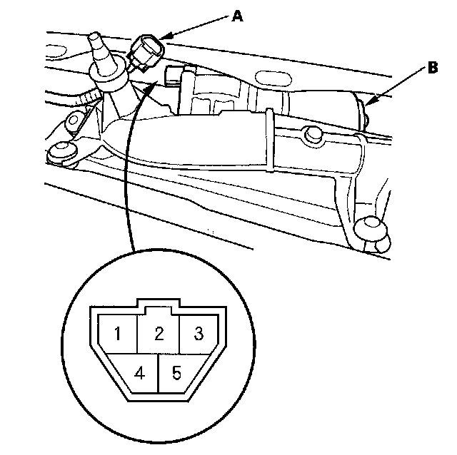 3. Disconnect the 5P connector (A) from the wiper motor (B).