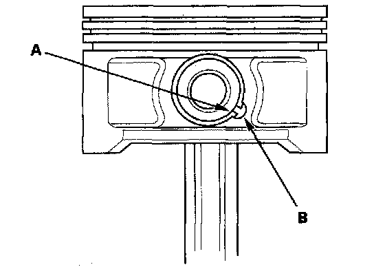 2. Apply new engine oil to the piston pin snap rings (A) and turn them in the ring grooves until the end gaps are lined up with the cutouts in the piston pin bores (B).