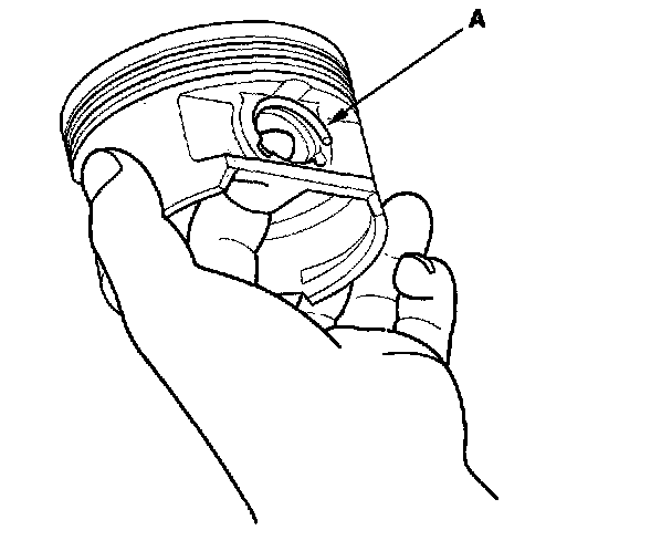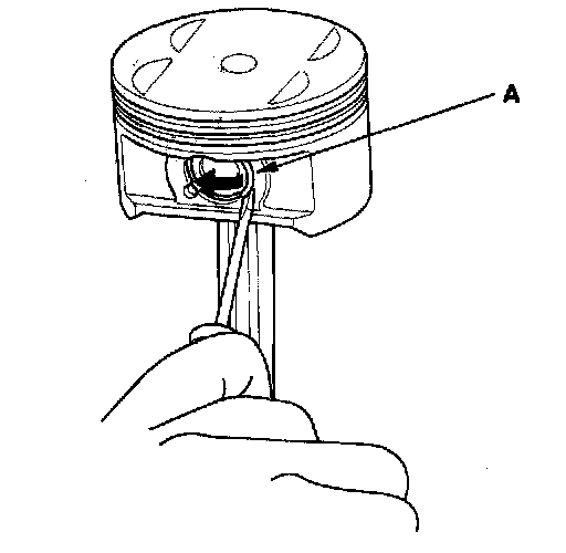 3. Remove snap, rings (A) from both sides of the piston. Start at the cutout in the piston pin bore. Remove the snap rings carefully so they do not go flying or get lost. Wear eye protection.
