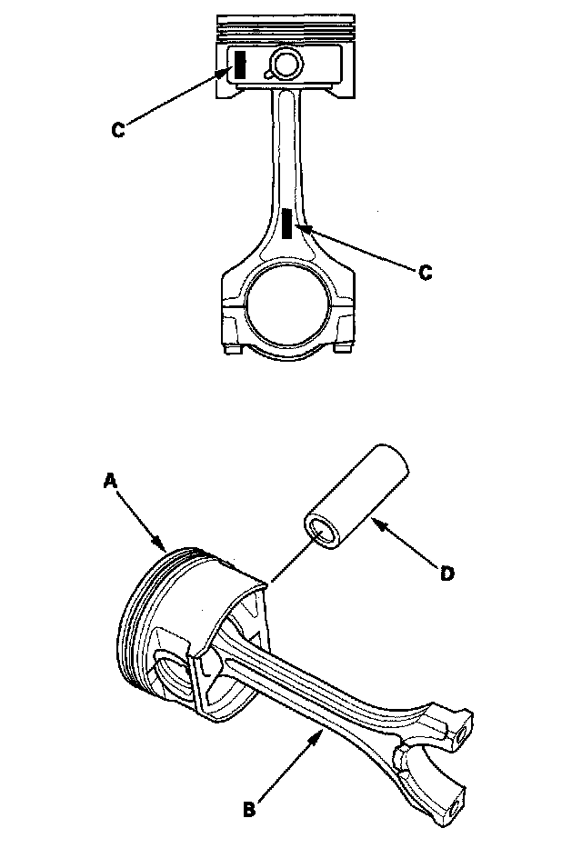4. Assemble the piston (A) and connecting rod (B) with the embossed marks (C) on the same side. Install the piston pin (D).
