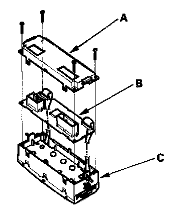 2. Remove the self-tapping screws, then carefully separate the climate control unit cover (A) and the control unit (B) from the control unit display (C). Do not kink or pull on the wires between the display and the control unit. Do not touch the electronic components on the printed circuit board in the control unit.