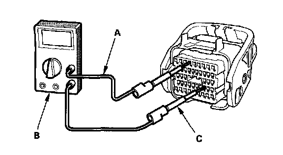 4. Connect one side of the patch cord (A) terminals to a commercially available digital multimeter (B), and connect the other side of the patch cord terminals to a commercially available banana jack (Pomona Electronics Tool No.3563 or equivalent) (C).