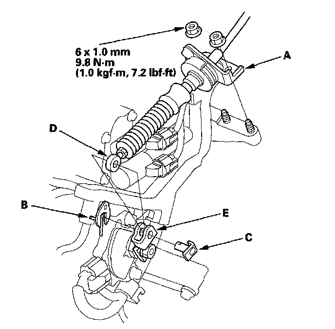 11. Remove the spring clip/washer (B) and control pin (C), then separate the shift cable end (D) from the control lever (E).