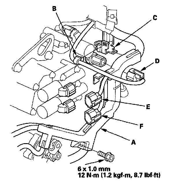 14. Disconnect the A/T clutch pressure control solenoid valve A connector (E), A/T clutch pressure control solenoid valve B connector (F), solenoid harness connector, transmission range switch connector, ATF temperature sensor connector, output shaft (countershaft) speed sensor connector, input shaft (mainshaft) speed sensor connector, and 3rd clutch transmission fluid pressure switch connector.