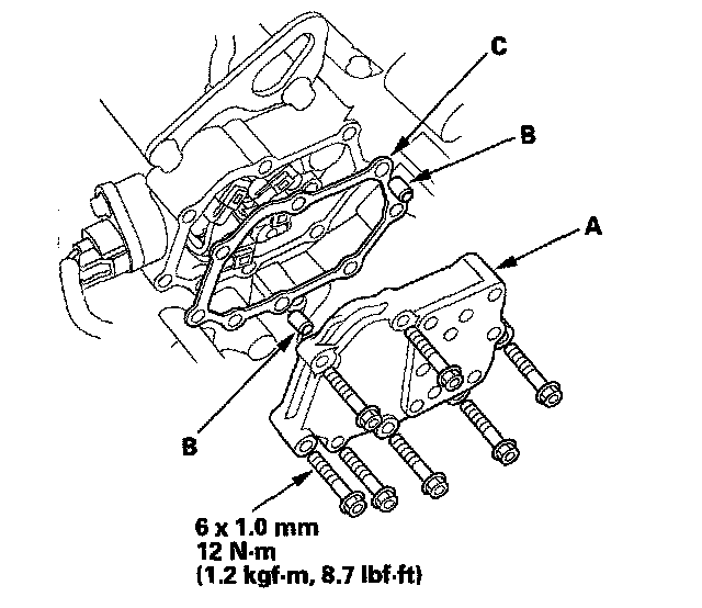 17. Remove the solenoid valve cover (A), dowel pins (B), and gasket (C).