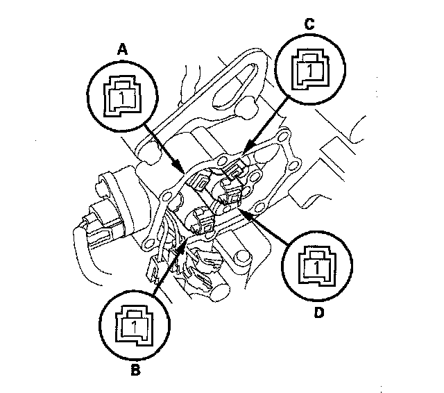 19. Disconnect shift solenoid valve A connector (A), shift solenoid valve B connector (B), shift solenoid valve C connector (C), and torque converter clutch solenoid valve connector (D).