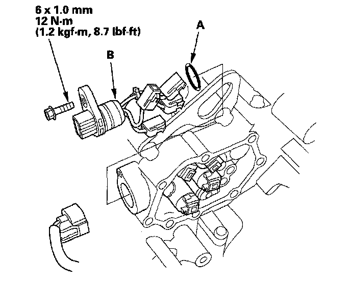 22. Remove the solenoid harness, and install a new O-ring (A) on the solenoid harness connector (B), and install the connector in the transmission housing.