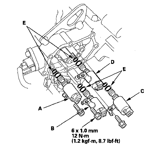 16. Replace the gasket and O-rings (E) with new ones when installing A/T clutch pressure control solenoid valve A and B.