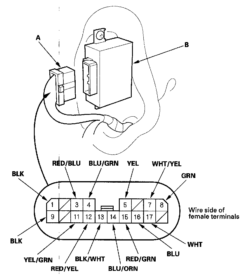 2. Disconnect the 18P connector (A) from the power window control unit(B).