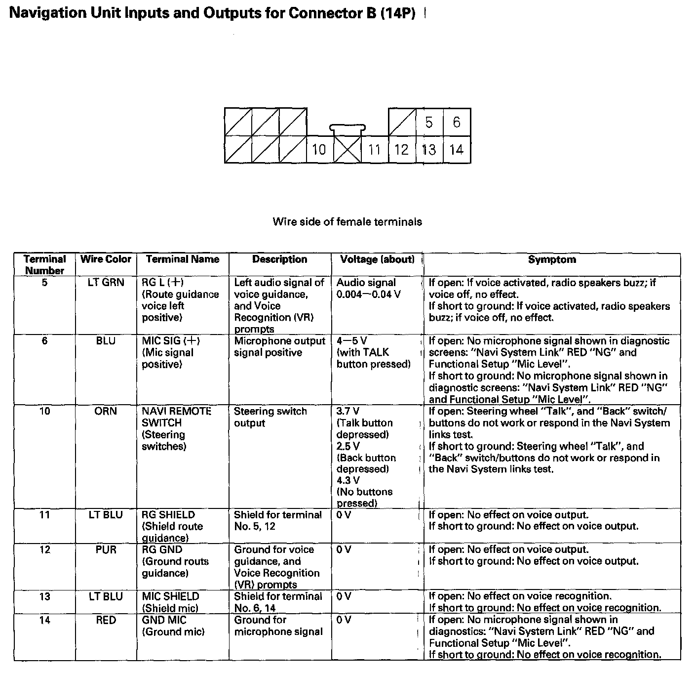 Navigation Unit Inputs and Outputs for Connector B (14P):