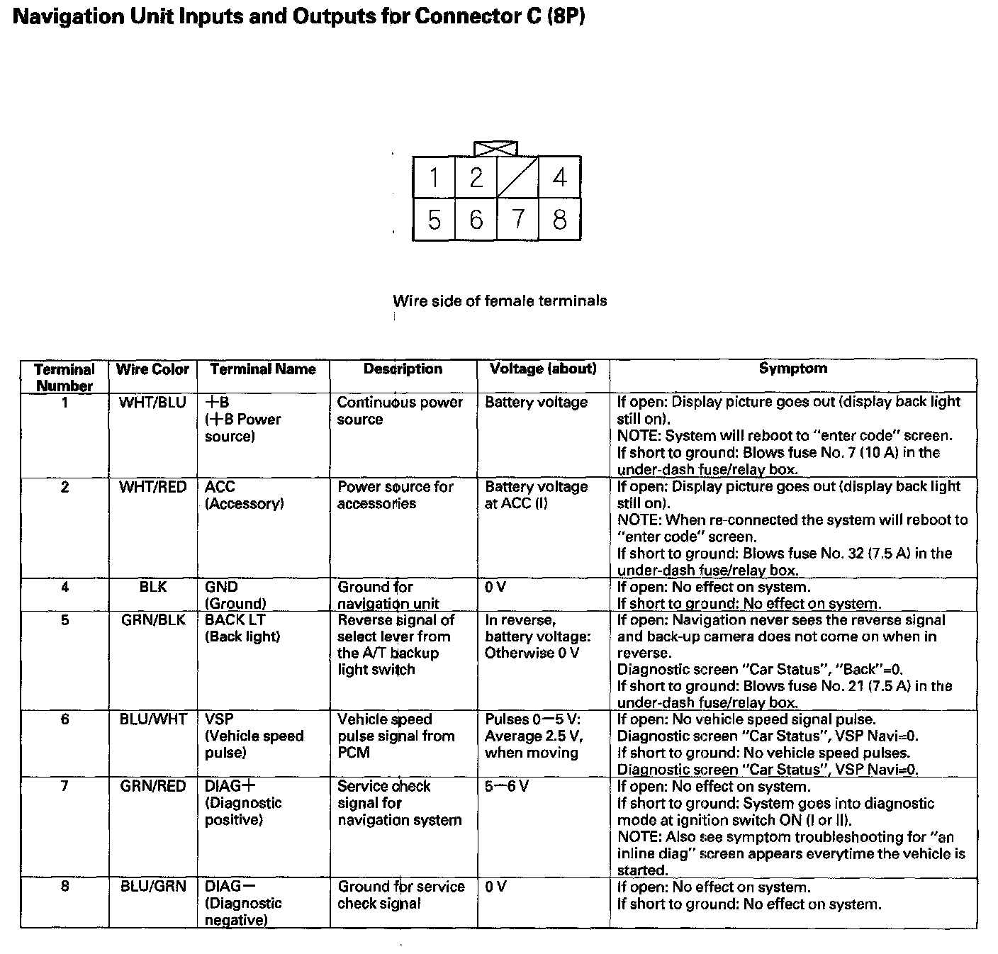 Navigation Unit Inputs and Outputs for Connector C (8P):