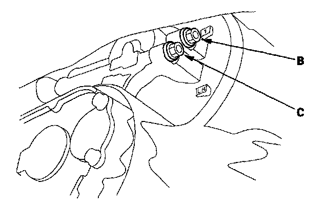 14. Measure the 1st clutch pressure at the 1st clutch pressure inspection port (B) and the 1st-hold clutch pressure at the 1st-hold clutch pressure inspection port (C) while holding the engine speed at 2,000 rpm.