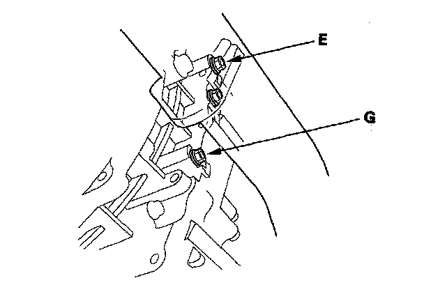 25. Shift to the D position; the transmission shifts into 4th gear, then 5th gear. Measure the 4th clutch pressure at the 4th clutch pressure inspection port (F) and the 5th clutch pressure at the 5th clutch pressure inspection port (G) while holding the engine speed at 2,000 rpm.