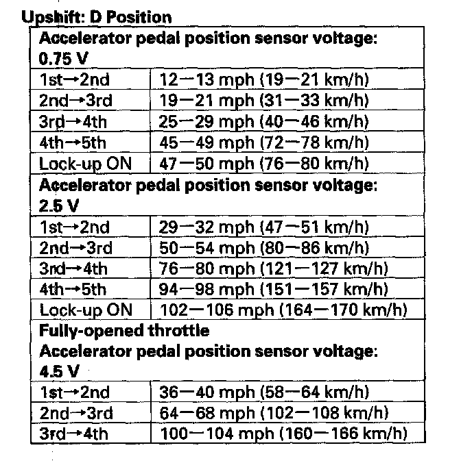5. Test-drive the vehicle on a flat road in the D position. Check for abnormal noise and clutch slippage. While driving, check that the shift points occur at the proper speeds by monitoring the accelerator pedal position sensor voltage with the HDS and comparing your shift point speeds and voltage to those in the table. (The accelerator pedal position sensor voltage represents the throttle opening.)