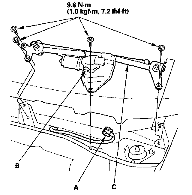 4. Remove the mounting bolts and the wiper linkage assembly (C).