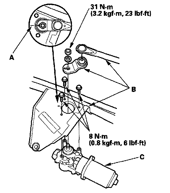 5. Scribe a line (A) across the link and windshield wiper linkage to show the original adjustment. Separate the windshield wiper linkage (B) from the wiper motor (C).