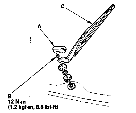 1. Remove the cover (A), mounting nut (B) and rear window wiper arm (C).