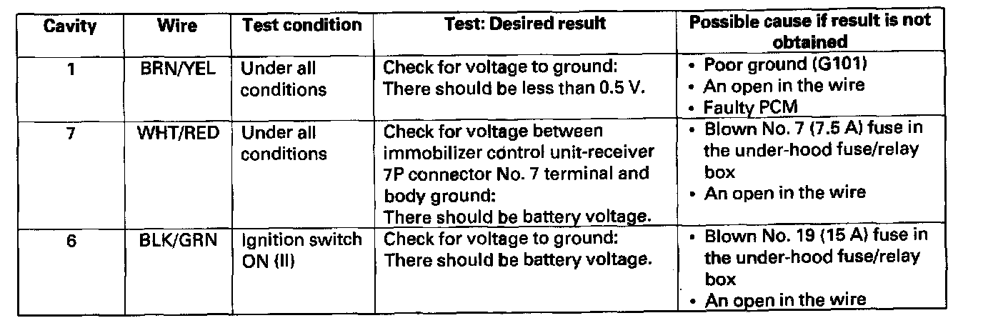 Immobilizer Control Unit-Receiver Input TestNOTE: Before troubleshooting check the No. 7 (7.5 A) and No. 19 (15 A) fuses in the under-dash fuse/relay box.