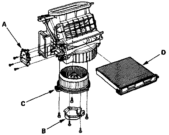 - The recirculation control motor (A), the blower motor cover (B), blower motor (C), and the dust and pollen filter (D) can be replaced without removing the blower unit.