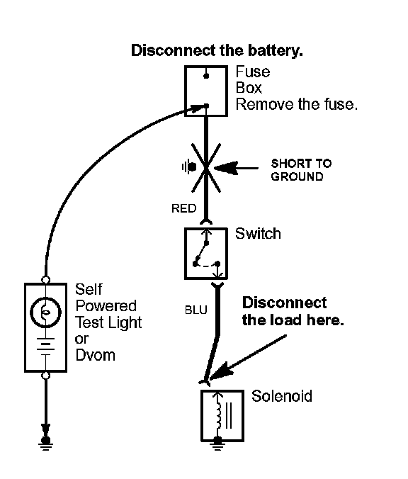 5. If the self-powered test light goes on or the DVOM displays a low reading or no reading (zero), there is a short to ground in the wiring near that point.