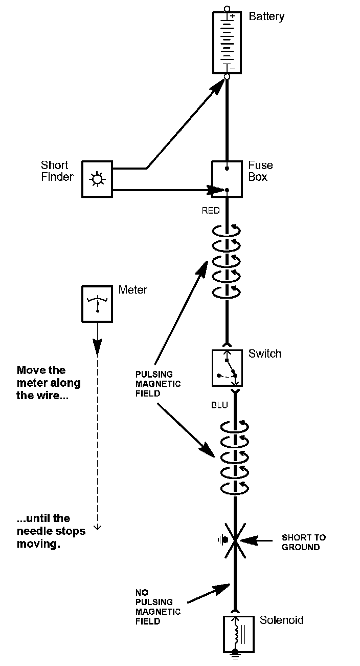 5. Beginning at the fuse box, slowly move the short finder along the circuit wiring. The meter will read current pulses through sheet metal and body trim. As long as the meter is between the fuse and the short, the needle will move with each current pulse. Once you move the meter past the point of the short, the needle will stop moving. Check the wiring and connectors in this area to locate the cause of the short.