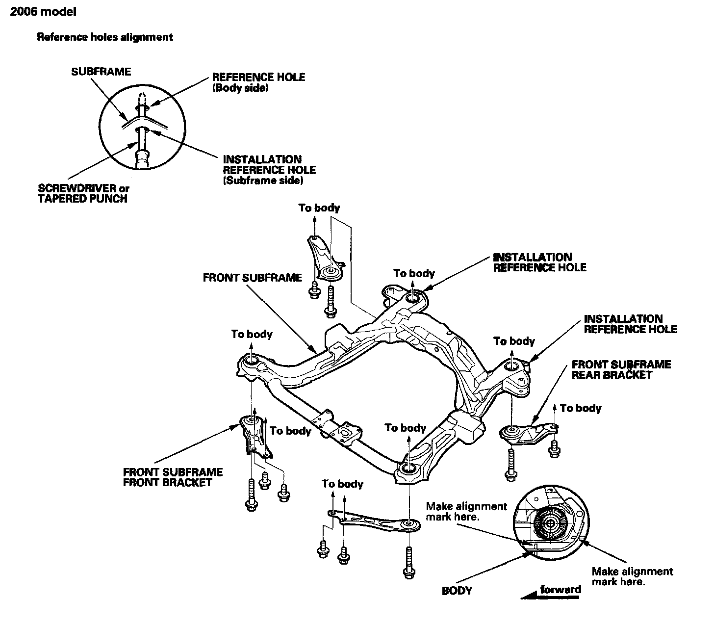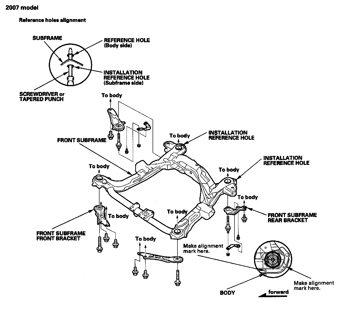 - When installing, align both installation reference holes in the subframe with the reference holes in the body using a screwdriver or tapered punch as a guide.