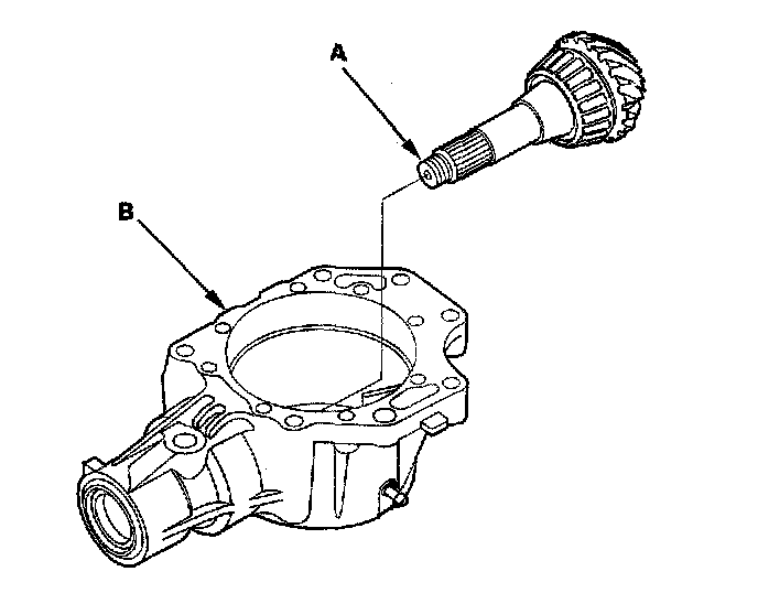 6. Install the transfer output shaft (hypoid gear) (A) in the transfer housing (B). Do not install the thrust washers and transfer spacer on the transfer output shaft.