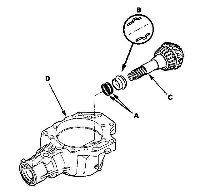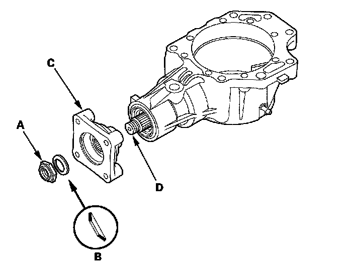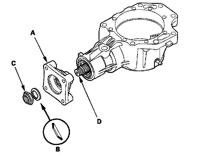 7. Install the companion flange (A), conical spring washer (B) in the direction shown, and locknut (C) on the transfer output shaft (hypoid gear) (D). Do not install the O-ring and back-up ring on the transfer output shaft.