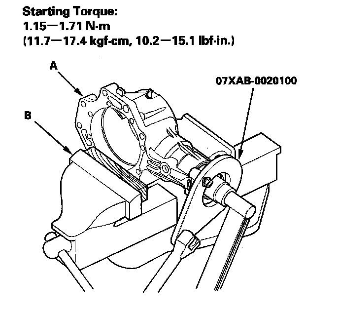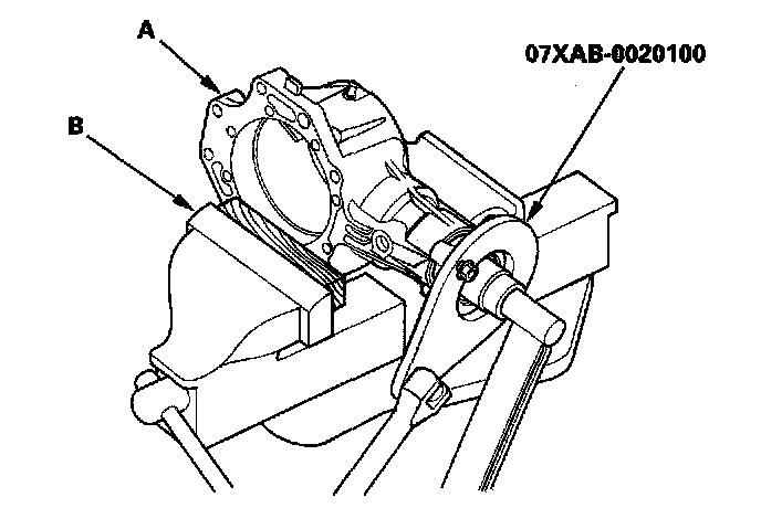 32. Secure the transfer housing (A) in a bench vise (B) with soft jaws, then install the special too[ on the companion flange. To prevent damage to the transfer housing, always use soft jaws or equivalent materials between the transfer housing and the vise.