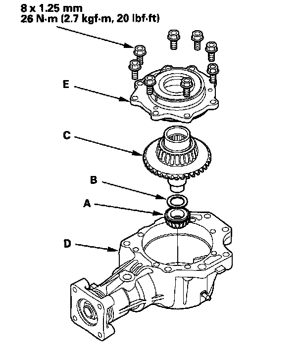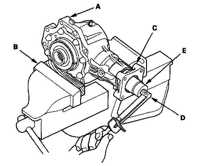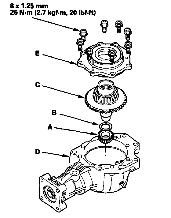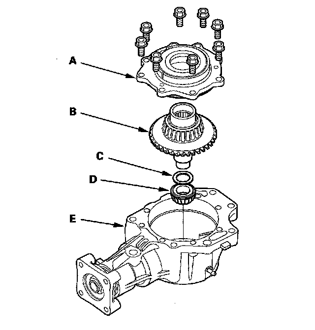 19. Remove the transfer cover (A), transfer hypoid drive gear/shaft assembly (B), 25 mm thrust shim (C), and tapered roller bearing (D) from the transfer housing (E) after adjusting the transfer gear backlash or transfer gear tooth contact.