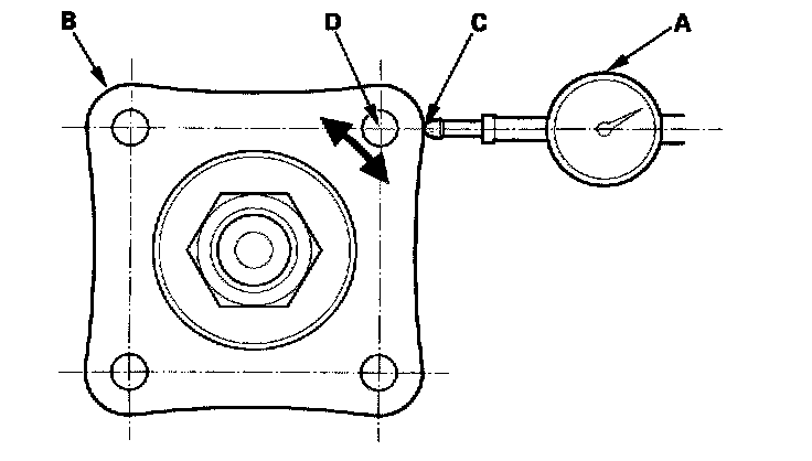 14. Set a dial indicator (A) on the transfer companion flange (B); position dial indicator tip (C) on the direct extension of the bolt hole center (D).