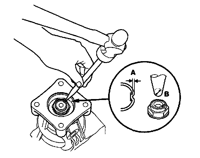 29. Stake the locknut in depth (A) of 0.7-1.2 mm (0.03-0.05 in.) using a 3.5 mm punch (B).