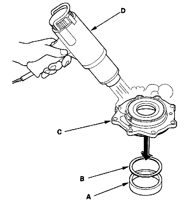 36. If the measurement is out of standard, remove the bearing outer race (A) and 80 mm thrust shim (B) from the transfer cover (C). If the bearing outer race is press-fitted, remove the bearing outer race by heating the cover to about 212° F (100° C) with a heat gun (D). Do not heat the cover more than 212° F (100° C).