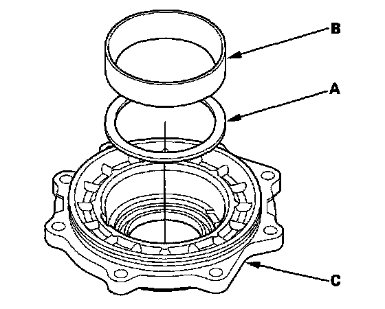 38. Install the 80 mm trust shim (A) and bearing outer race (B) in the transfer cover (C). If you heated the cover, let it cool to room temperature before installing the thrust shim.