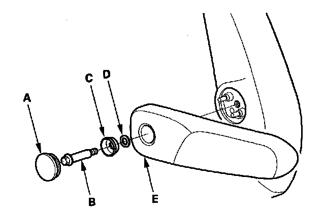 2. Remove the center pin (B), bushing (C), and washer (D), then remove the armrest (E).