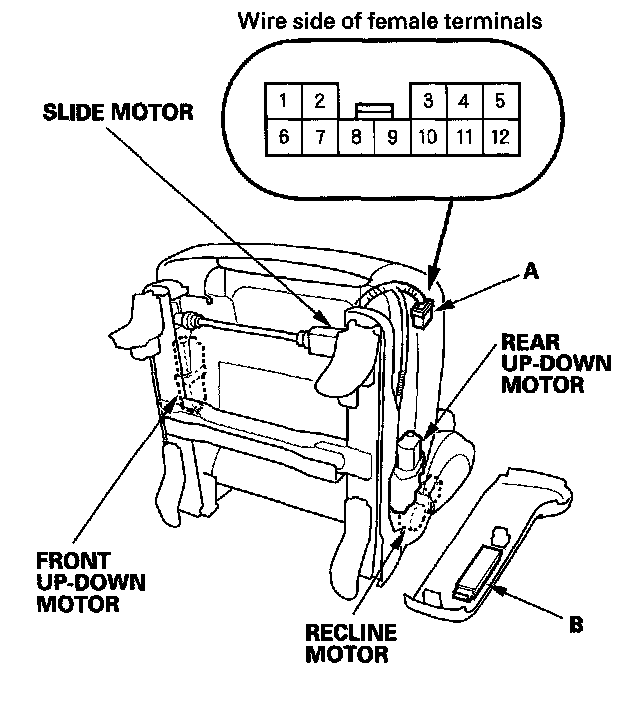 2. Disconnect the 12P connector (A) from the power seat adjustment switch (B).