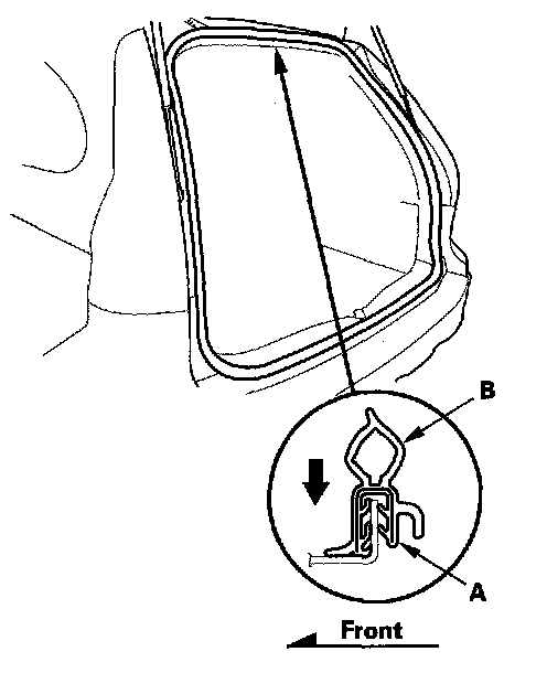 2. Locate the painted alignment mark (A) on the tailgate weatherstrip (B). Align the painted mark with the alignment tab in the center of the tailgate opening, and install the weatherstrip. Make sure it's seated completely and facing in the direction shown. Make sure there are no wrinkles in the weatherstrip.