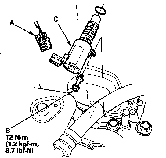 2. Remove the bolt (B) and the VTC oil control solenoid valve (C).