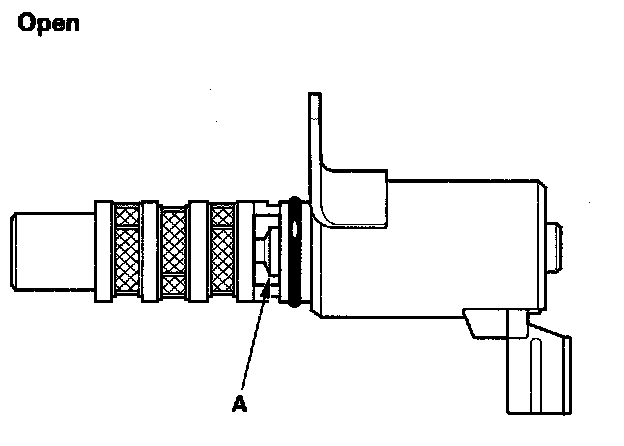 6. Connect the battery negative terminal to VTC oil control solenoid valve 2P connector terminal No. 1. Appearance of inner valve (A) in the port should be at least 0.05 in. (1.2 mm). If the inner valve does not open, replace it; then go to step 7.