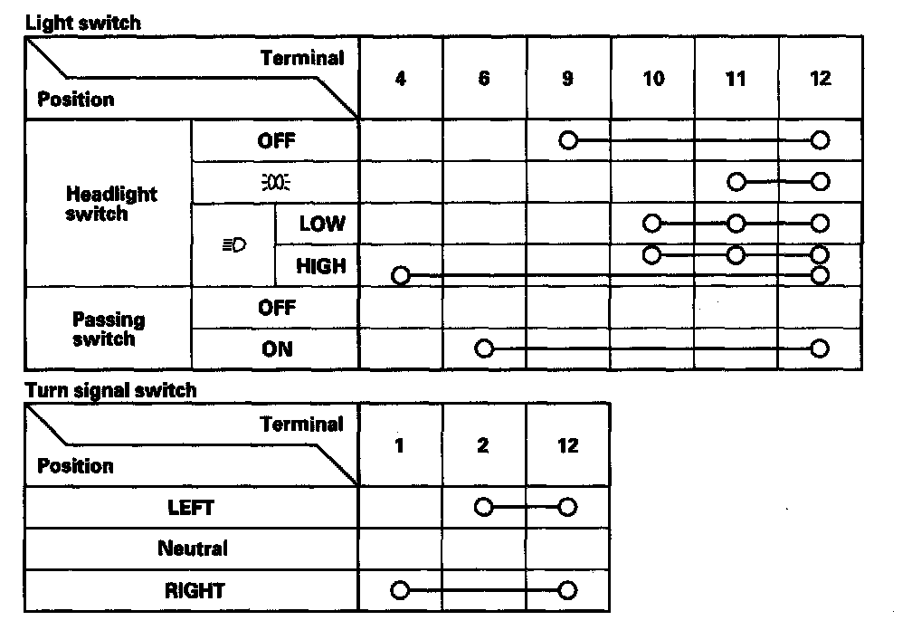 - If the terminals look OK, check for continuity between the terminals in each switch position according to the tables.