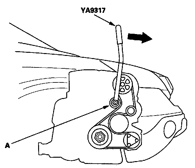 1. Move the auto-tensioner (A) using the belt tension release tool to relieve tension from the drive belt, then remove the drive belt.