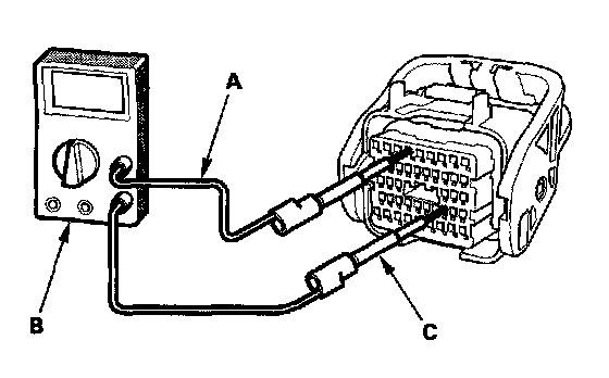 7. Connect one side of the patch cord (A) terminals to a commercially available digital multimeter (B), and connect the other side of the patch cord terminals to a commercially available banana jack (Pomona Electronics Tool No. 3563 or equivalent) (C).