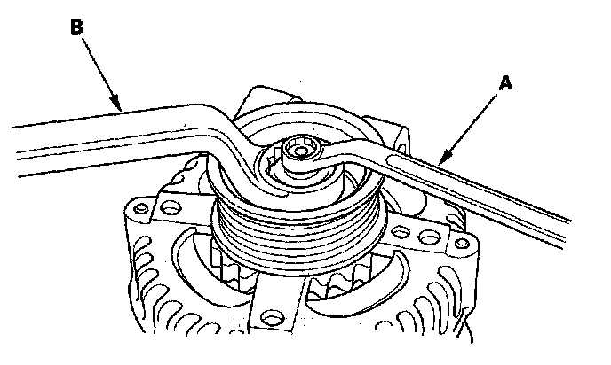 3. If the front bearing needs replacing, remove the pulley locknut with a 10 mm wrench (A) and a 22 mm wrench (B). If necessary, use an impact wrench.