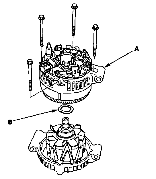 7. Remove the four bolts, then remove the rear housing assembly (A), and washer (B).