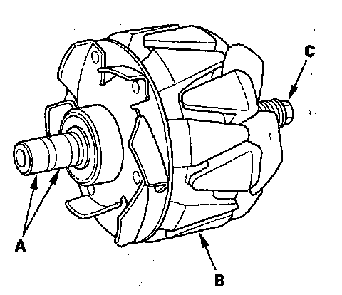 15. Check for continuity between each slip ring and the rotor (B) and the rotor shaft (C).