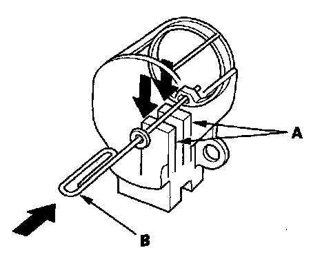 19. Push the brushes (A) in, then insert a pin or drill bit (B) (about 1.6 mm (0.06 in.) diameter) to hold them there.