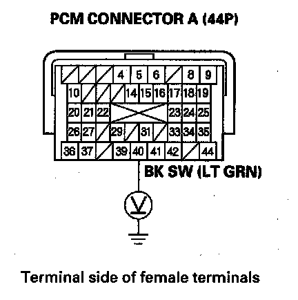 18. Measure the voltage between PCM connector terminal A40 and body ground while pressing the brake pedal and when the brake pedal is released.