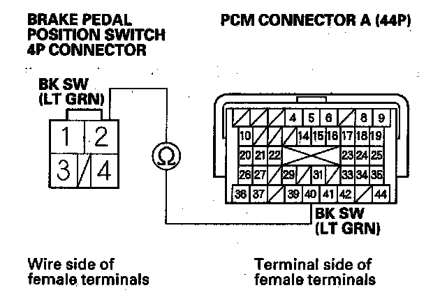 19. Disconnect brake pedal position switch 4P connector, and check for continuity between PCM connector terminal A40 and brake pedal position switch 4P connector terminal No. 2.