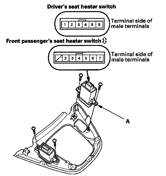 2. Disconnect the 6P (or 7P*) connector from the seat heater switch (A), then remove the switch.